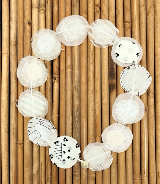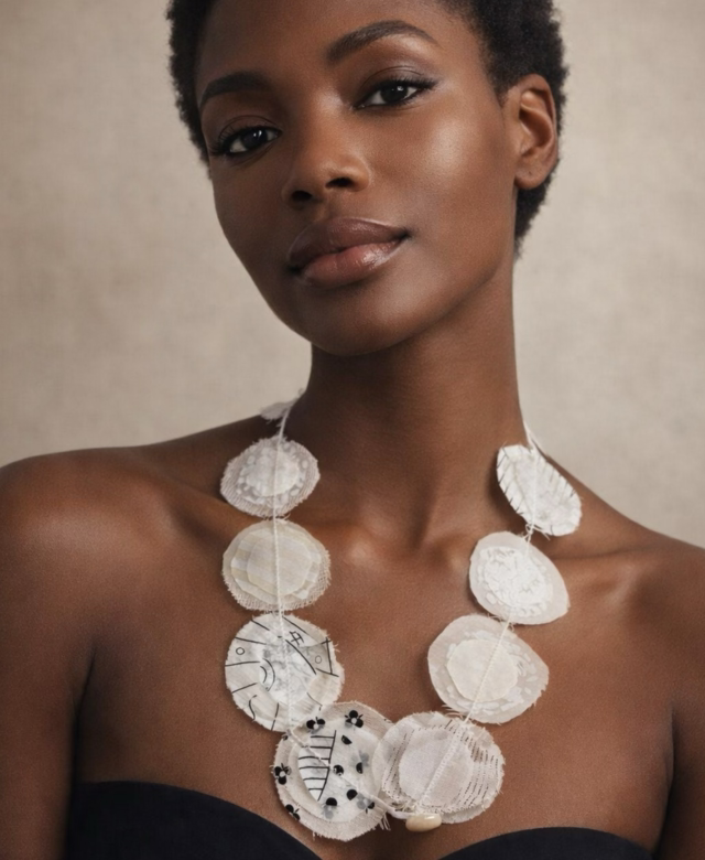 Questa collana nasce dagli scarti di lusso dell’Atelier ASÜRo: tessuti preziosi che trovano nuova vita in un gioiello leggero e unico.