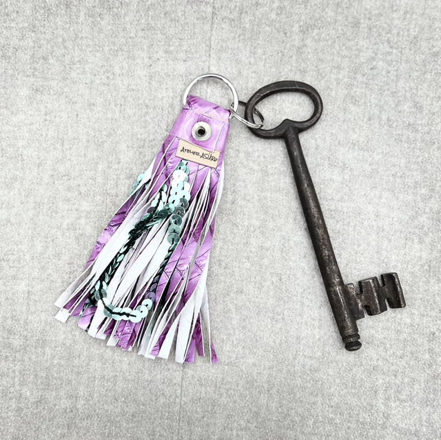 Elegant handmade keychain in eco-leather with sparkling sequins, measuring 14 cm. Made in Switzerland, each piece is unique, crafted with care to be truly one of a kind.