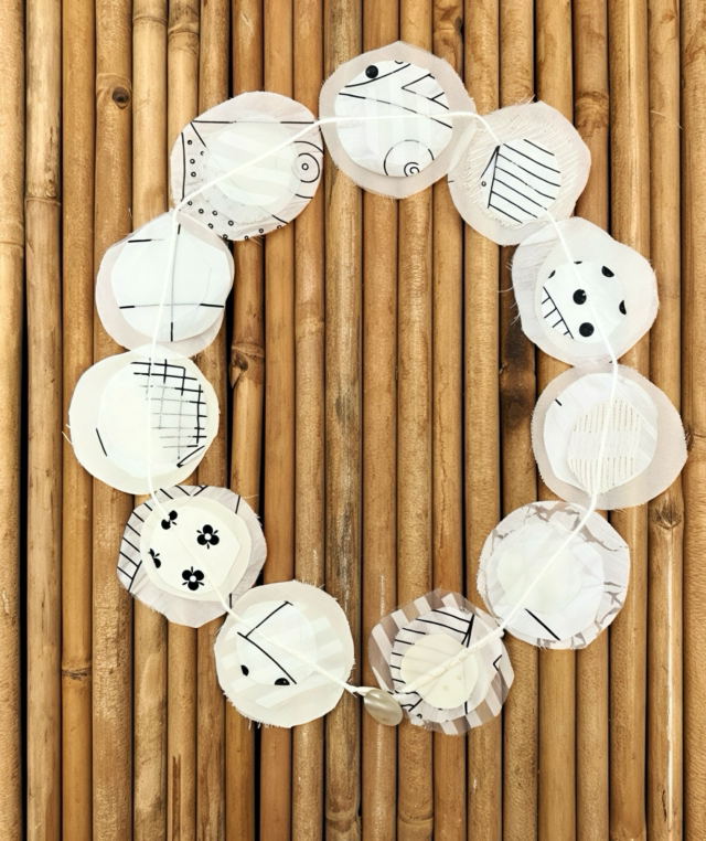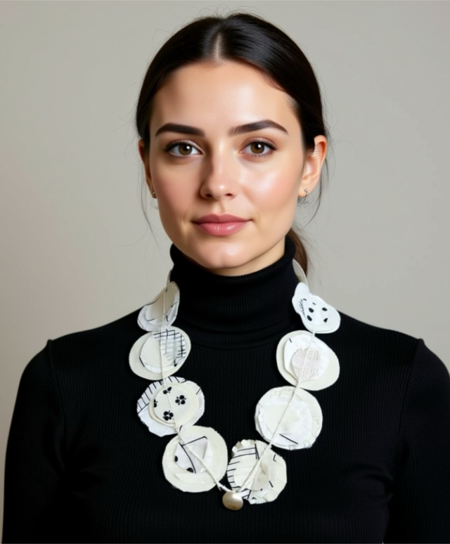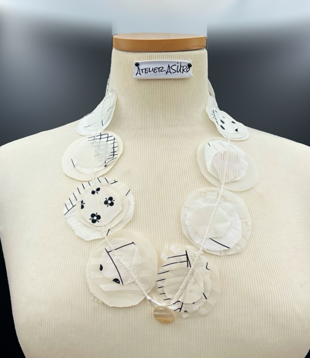 Questa collana nasce dagli scarti di lusso dell’Atelier ASÜRo: tessuti preziosi che trovano nuova vita in un gioiello leggero e unico.